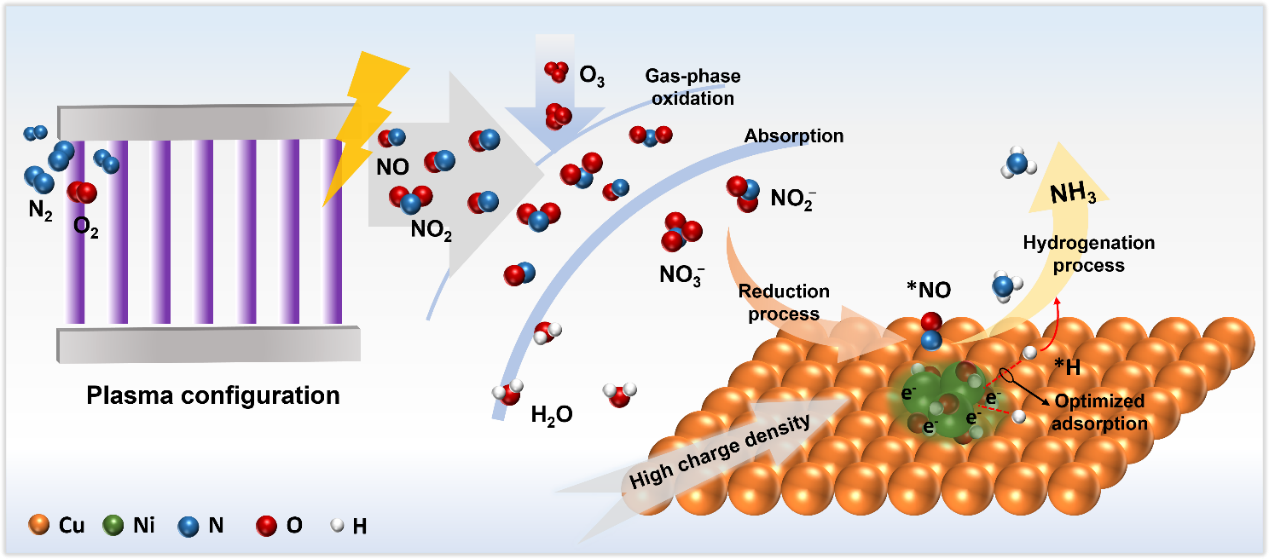近日,西安交通大学电气工程学院等离子体生物医学中心周仁武教授团队在绿色合成氨领域取得重要进展。针对当前电化学硝酸根还原(NO3RR)制氨技术仍依赖工业硝酸盐、难以实现真正可持续的关键瓶颈,研究团队创新提出“等离子体—电催化耦合”的空气制氨新策略:首先利用等离子体技术,直接从空气中连续生成组分可调的氮氧化物(NOx-)电解质,进而与后续电催化制氨过程实现无缝衔接与系统集成。该研究将空气等离子体氧化与电催化还原有机结合为一个整体系统,并统一考量两个关键设计问题:一是如何调控进入吸收段的氧化性物种组成,二是如何优化电催化界面的质子供给与转移过程。通过对比五种空气放电方式,团队发现,采用并联介质阻挡放电(DBD)与滑动弧(GA)的复合等离子体构型,可高效促进空气中氮的氧化,并实现产物的稳定吸收,在碱性条件下获得高浓度液相 NOx-,可直接用作合成氨的电解质。在此基础上,团队进一步研制出 Ni(OH)2@Cu 纳米线异质界面电催化剂,使系统在大电流密度下仍保持高氨产率(5.18 mmol h-1cm-2),并显著降低整体能耗(2.89 kWh·mol-1)。机理研究表明,该异质界面处的高电荷密度能有效增强表面 *H 的吸附与活化能力,降低 *NO 氢化的反应能垒,同时抑制析氢副反应,实现对界面“质子经济”的精准调控。该工作系统打通了“空气 →NOx-→ 氨”的完整转化路径,为可再生电力驱动的高效、低碳合成氨提供了具有潜力的新工艺与设计思路。