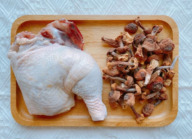 鸡肉焯水去血沫,姬松茸切片备用;砂锅中加清水1.5L,放入鸡肉、姜片大火煮沸后转小火炖1小时;加入姬松茸、枸杞再炖30分钟,最后加盐调味。关键点:鸡肉先炖出胶质,再放菌菇避免久煮变柴;若用干菇,泡发水可替代部分清水。