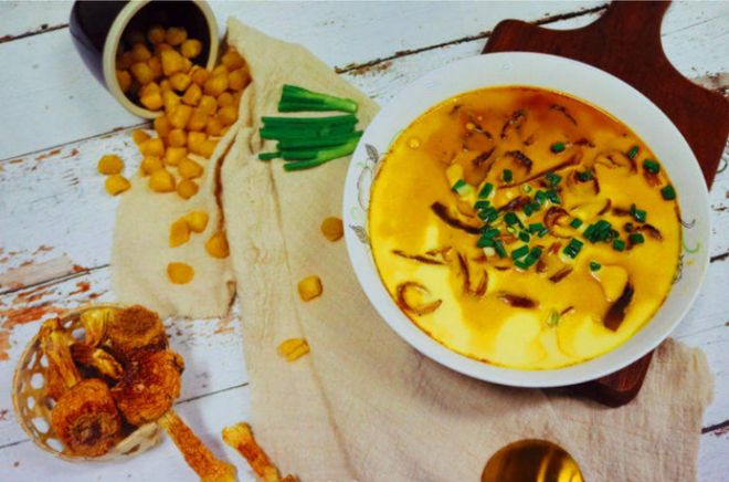 3. 姬松茸蒸蛋——家常菜的精致化蛋液(鸡蛋2个)与温水按1:1.5比例调匀,过滤后铺上姬松茸薄片,覆保鲜膜扎孔,蒸8分钟关火焖2分钟,出锅滴香油。
