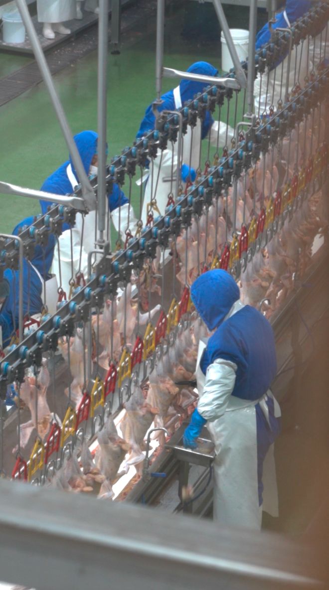 眼前,几名工人穿着严实的工作服站在一条流水线旁,左右手从白色鸡笼中各自抓起一只鸡,把鸡脚悬挂在挂钩上,鸡便随着流水线设备的运转,逐步进入下一环节,电晕、漂烫、脱羽、开膛等等20道工序结束后,会被工人冷冻包装,放入到储存仓库。
