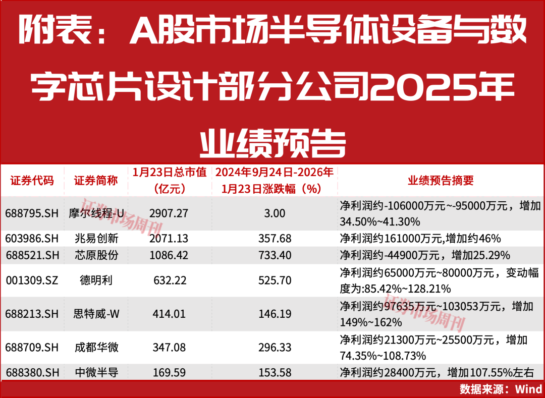 事实上,在最近几年半导体国产替代和AI算力浪潮共同推动下,半导体设备和数字芯片设计领域相关公司享受到政策和市场需求快速扩张的双重红利,出现估值和业绩共振情形。据最新2025年业绩预告披露,中微公司(688012.SH)、兆易创新(603986.SH)业绩稳增,而摩尔线.SH)等则显著减亏,另有多家公司业绩实现翻倍增长。