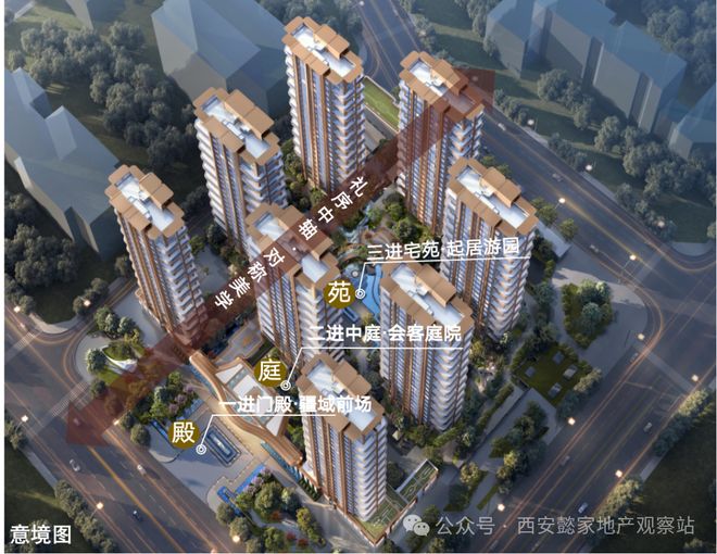建筑规划溯源盛唐宫阙营造法式,整体布局恪守绝对对称的古典美学原则,创新演绎三横三纵空间格局。横向三轴线依殿-庭-苑空间序列层层递进,构建起登堂-入庭-游园的三进制归家之礼。纵向三重轴线则巧妙呼应当今西安三轴线城市规划布局,实现传统空间规制与现代城市肌理的时空对话。