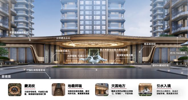主入口门庭承袭天圆地方的千年营造智慧,以约90米恢弘跨度与约10米挑高空间,构筑酒店式落客尊仪。穹顶透光云石演绎天光垂象,地面宝相花夔龙纹铺陈地载祥瑞,形成完整的天地礼制空间。门前舒兴川大师高定引水逐玉主题雕塑,云水相生,形意流转,寓意天地和谐、万物共生之境。